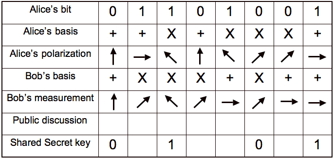 Each "qubit" has three values: bit, basis, polarization.
